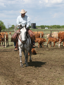 This flashy grey gelding, straight from the Hawthorne Ranch breeding program in Nebraska, is the perfect pasture horse. With his ground-eating trot he's the mount you want when you have miles to make. He's seen two solid summers of ranch work, including dragging calves to the branding fire and pasture doctoring, and would be a solid addition to your ranch remuda. |